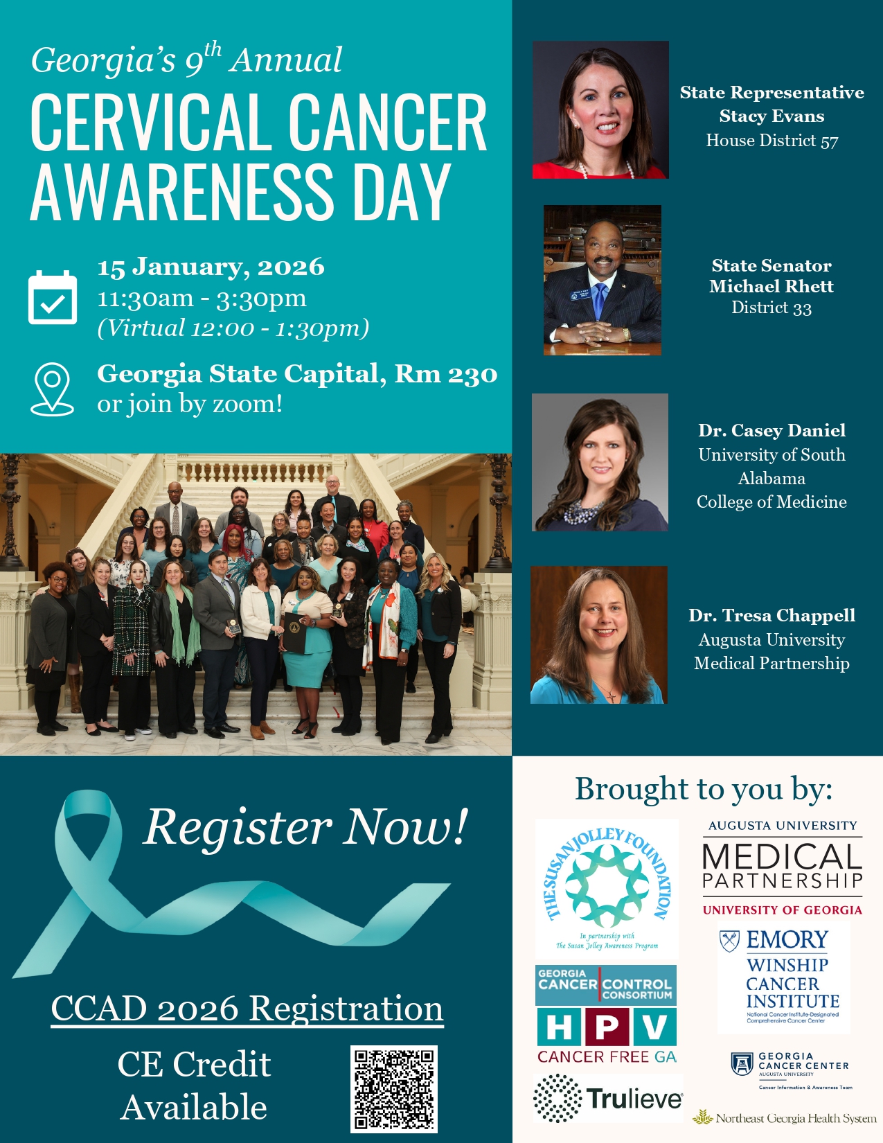 Join us on Thursday, January 15, 2026 for the 9th Annual Georgia Cervical Cancer Awareness Day. Join State Representative Stacey Evans, State Senator Michael Rhett, Dr. Casey Daniel, Dr. Tresa Chappell, and other advocates at the Georgia State Capitol for Eliminating Cervical Cancer Advocacy. A virtual option is available and you will receive the link upon registration.