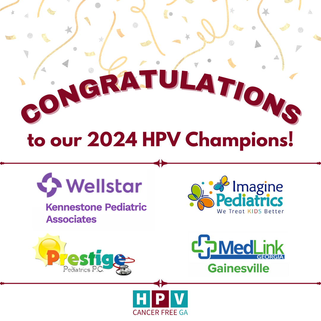 On January 21, 2021 the HPVCancerFreeGA working group, alongside the Susan Jolley Awareness Program, and the Georgia Cancer Control Consortium hosted our 4th annual Cervical Cancer Awareness day event. Over 50 participants joined us in discussing the importance of HPV Vaccination to prevent Cervical Cancer. We were joined by FIVE HPV Vaccine Champions (3 healthcare providers and 2 community based organizations) recognized for their efforts to improve HPV Vaccination acceptance and coverage across the state. We were also joined by Georgia State Representative, Teri Anulewicz who has been a staunch supporter for the HPV vaccination and who continues to support our efforts towards advocacy and promotion of the HPV vaccination. 1. Creekview Pediatrics. 2. Athens Kids Specialists. 3. White's Pediatrics. 4. Northwest Georgia Regional Cancer Coalition. 5. Brenau University